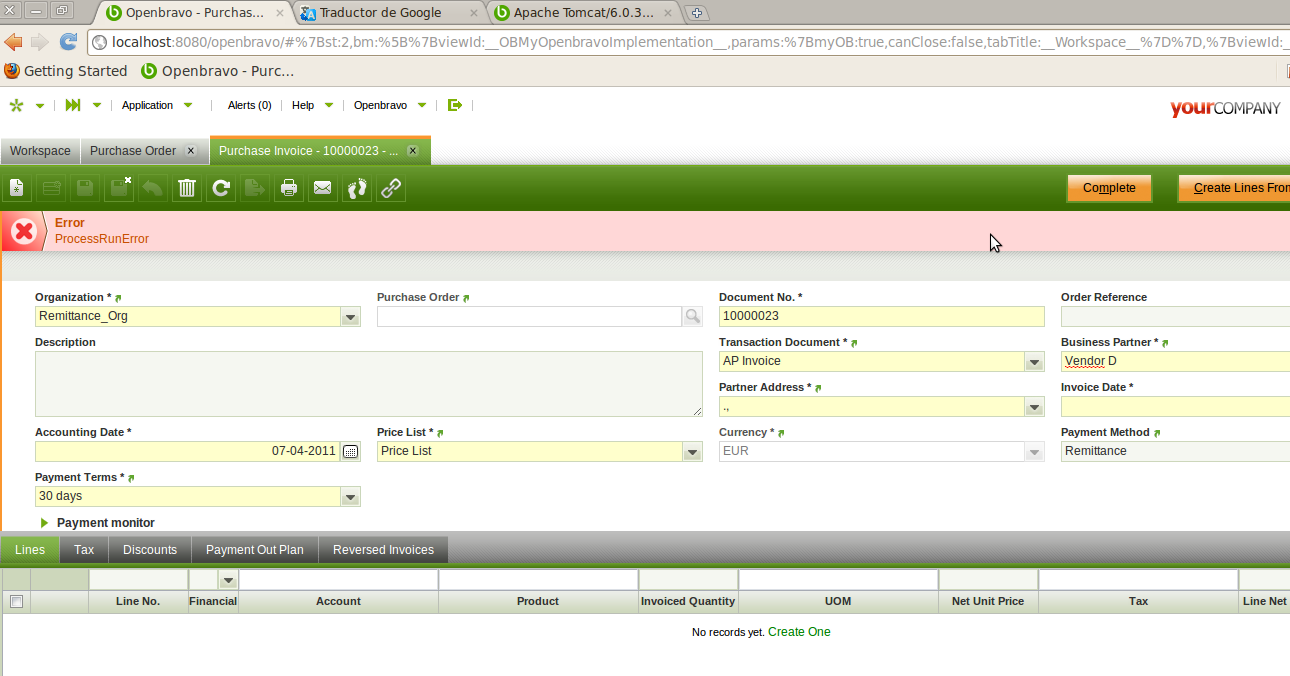 on CreateFrom.java file on the saveInvoice method there is one catch where the message to show when error is not managed properly. } catch (final Exception e) { try { releaseRollbackConnection(conn); } catch (final Exception ignored) { } e.printStackTrace(); log4j.warn("Rollback in transaction"); myMessage = Utility.translateError(this, vars, vars.getLanguage(), "ProcessRunError"); } return myMessage; } |