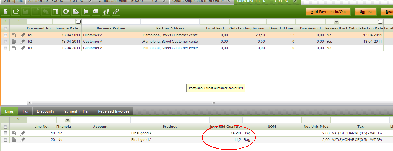 4. If you go again to the sales invoice and click "Create lines from" you now see the order. You select it and complete but has two lines!!. See attach twolines.png