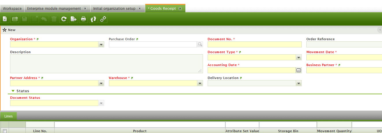 | Description | Goods receipt window and goods shipment don't work. All fields in blank See attach | |||||||