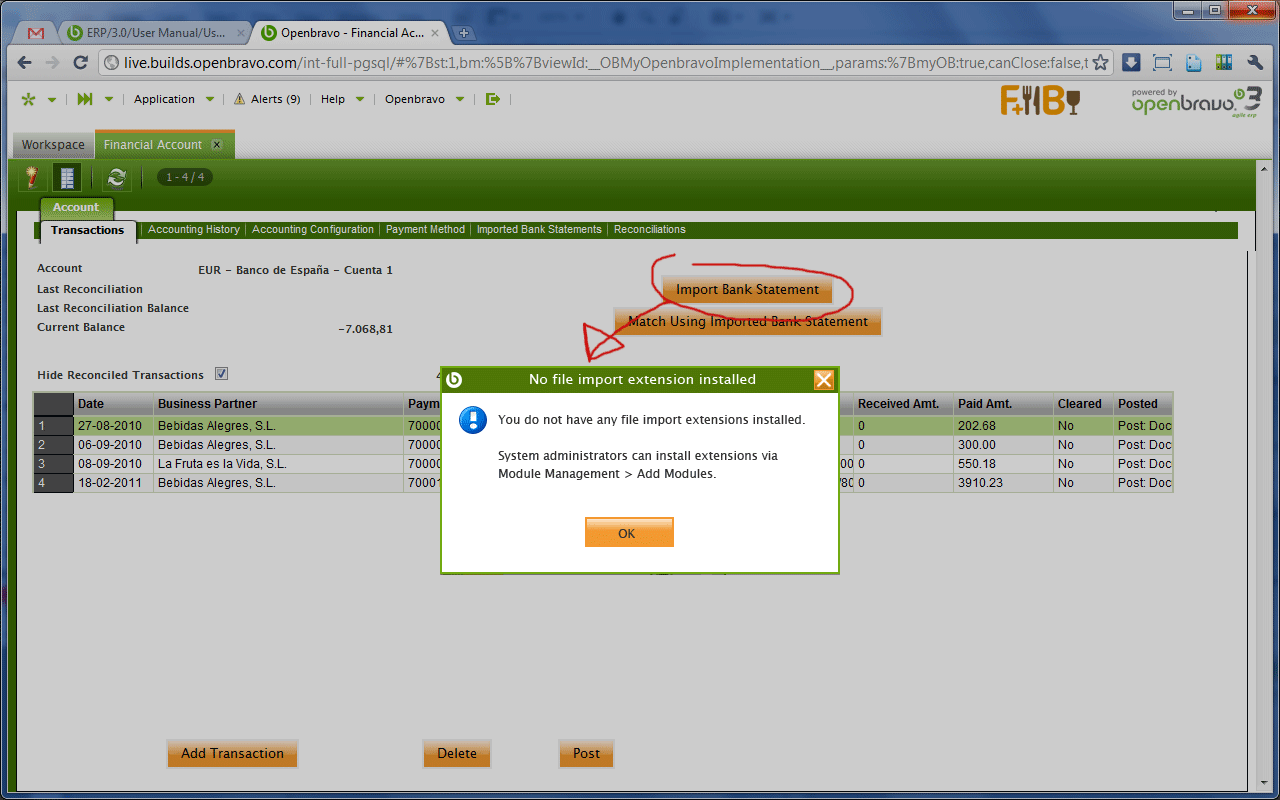 | Description | Now, when trying to Import a bank statement when in financial account, the user is left to her own devices to figure out that she first needs to install a "bank statement format importer" module, such as cuaderno 43 or OFX in order to be able to import the bank statement file. This is not cool as the user can proceed selecting a file (any format) just to later receive an error. it is also a missed upsell opportunity into Basic Edition. | |||||||