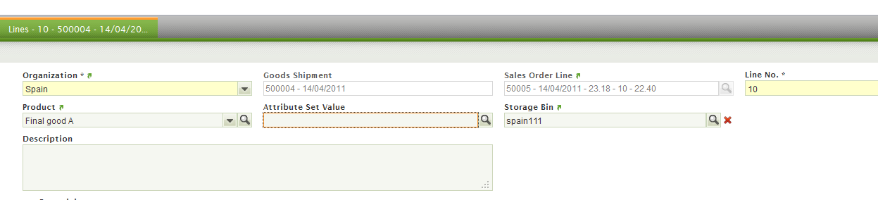 | Steps To Reproduce | Login with: "User name": Openbravo "Password": Openbravo Change the role to QA testing Admin Go to Sales management || Transactions || Sales order Click New and select: "Transaction Document": Standard Order "Business partner": Select Customer A Click Save and move to lines Click new and type FGA for the product and press Enter key. Verify: Change the "Ordered Quantity" to 11.2 and verify the "Line Net Amount" is 22.40 Click Save and move back to the Header tab Click Complete button and press OK Go to Sales management || Transactions || Goods shipment Click New and select: "Document Type": MM Shipment "Business partner": Select Customer A Click "Create Lines From". A pop-up gets opened. Do: Click the Warehouse icon and remove "USA Warehouse" from the warehouse field. Click Search and select the record (spain111) Select the sales order created above In the grid it will appear one record. Mark the record and press the OK button A green success message will appear: Process completed successfully Move to Lines tab. Select the record and enter in form view Click the icon for the product. A pop-up will be opened. Select the record and press OK (see attach selector.png) Verify: "Attribute Set Value": L56 "Storage bin": spain111 "Movement Quantity": 11.2 Here it comes the error. "Attribute Set Value" remains in blank. See attach Attribute and it should have the value L56 | |||||||