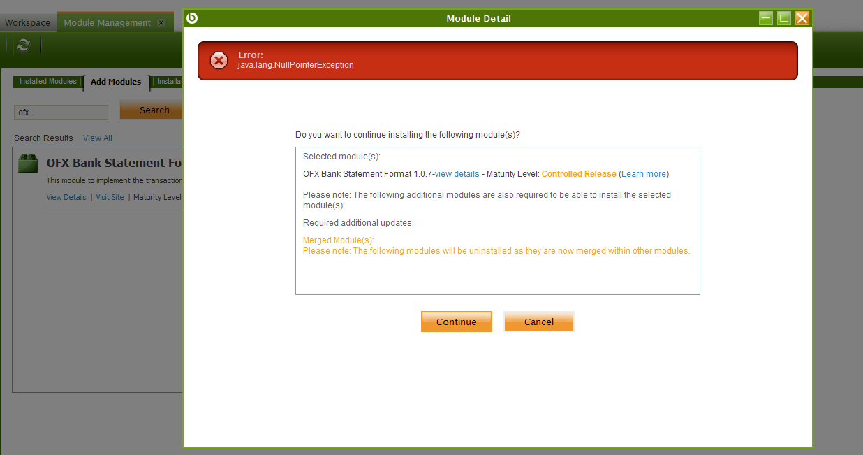 | Steps To Reproduce | 1. Being in a community instance 2. Login as Openbravo/openbravo 3. Change the role to system admin 4. Go to module management console 5. Move to add modules 6. Search for ofx 7. Click install module You will get the NPE. This is wrong | |||||||