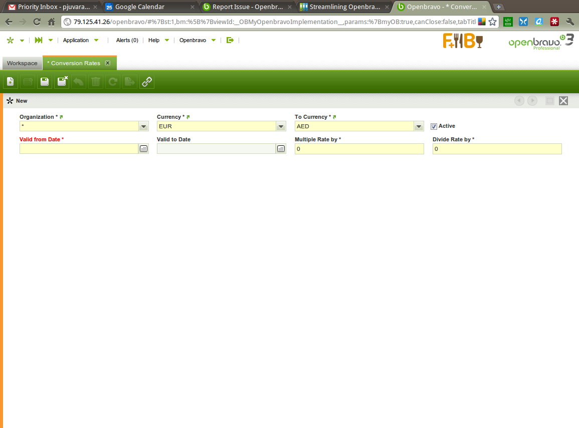 | Description | The currency conversion rates window has the following incorrect configurations (from most offending to least offending): 1) The field of first focus is "Valid from Date"; it should be "To Currency" instead (this makes entering data **really** painful. 2) "Currency" is always defaulted to "EUR". Instead, it should be defaulted to the base currency of the client. This affects users' perception of Openbravo as a global solution able to be localized (not matter what you do, it works in euros...) 3) Label capitalization: "Valid From Date" and "Valid To Date" instead of "Valid from Date" and "Valid to Date". "Multiply Rate By" and "Divide Rate By" instead of "Multiply Rate by" and "Divide Rate by". 4) Window Layout in three rows instead of two A more effective layout would be: Organization - Active Currency - To Currency Valid From Date - Valid To Date - Multiply Rate By - Divide Rate By | |||||||