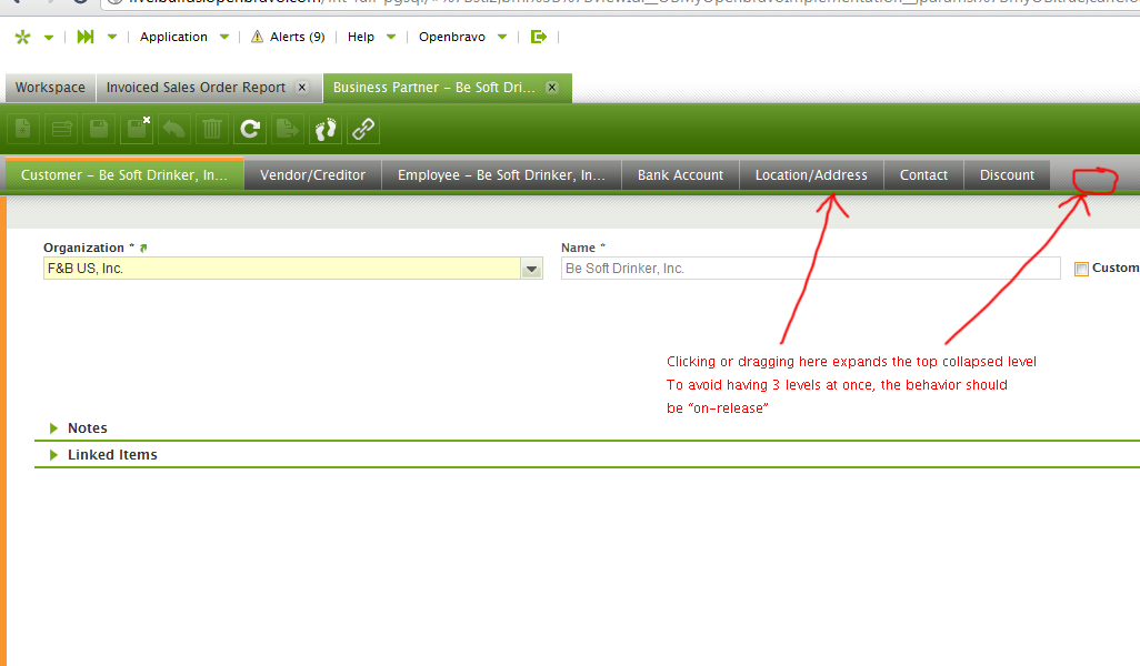 Almost there. There is one part that does not behave ideally: Grand child tab is maximized (e.g. Line Tax in a sales order) Click on lines tab -> expands (good) Now click on lines tab again -> maximizes (pushes the Line Tax tab to the bottom). This last step should move the Lines tab to the middle instead, so it behaves the same at all times. Only a double click should maximize a level. Perhaps the solution is to remove the memory of previous state. So summarizing behavior will be as follows. - Single click on a tab when the level above it is collapsed: expand the collapsed level - Single click on a tab when it is collapsed: expand it - Single click on a tab when it is collapsed and also the level above it is collapsed: expand its own level. Now another single click would also expand the level above. |