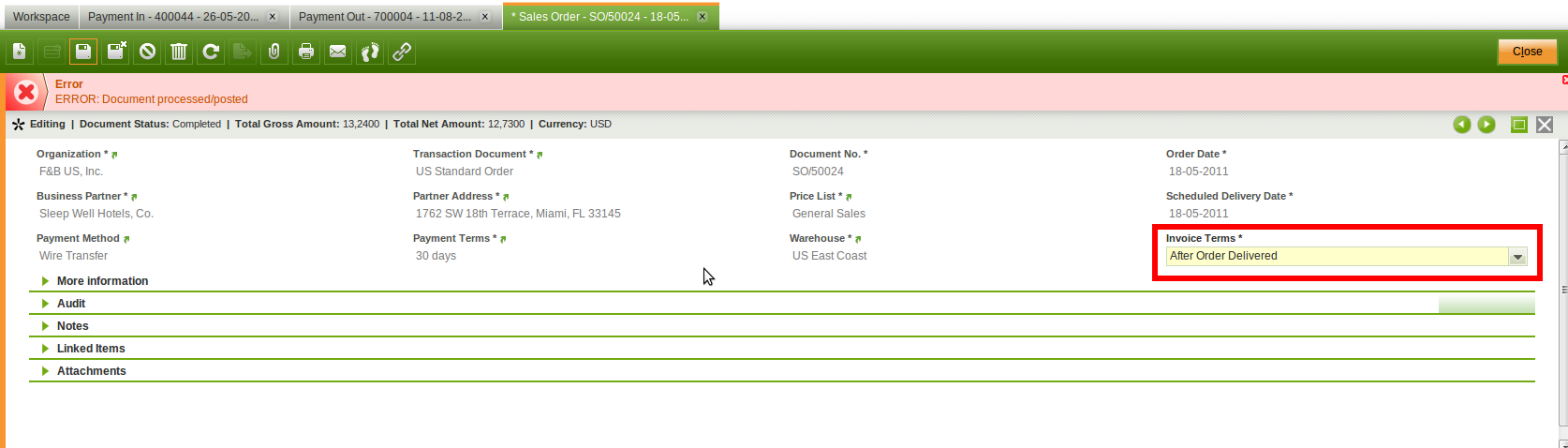 | Summary | 0017242: Not possible to update the Invoice Terms in a processed Order | |||||||