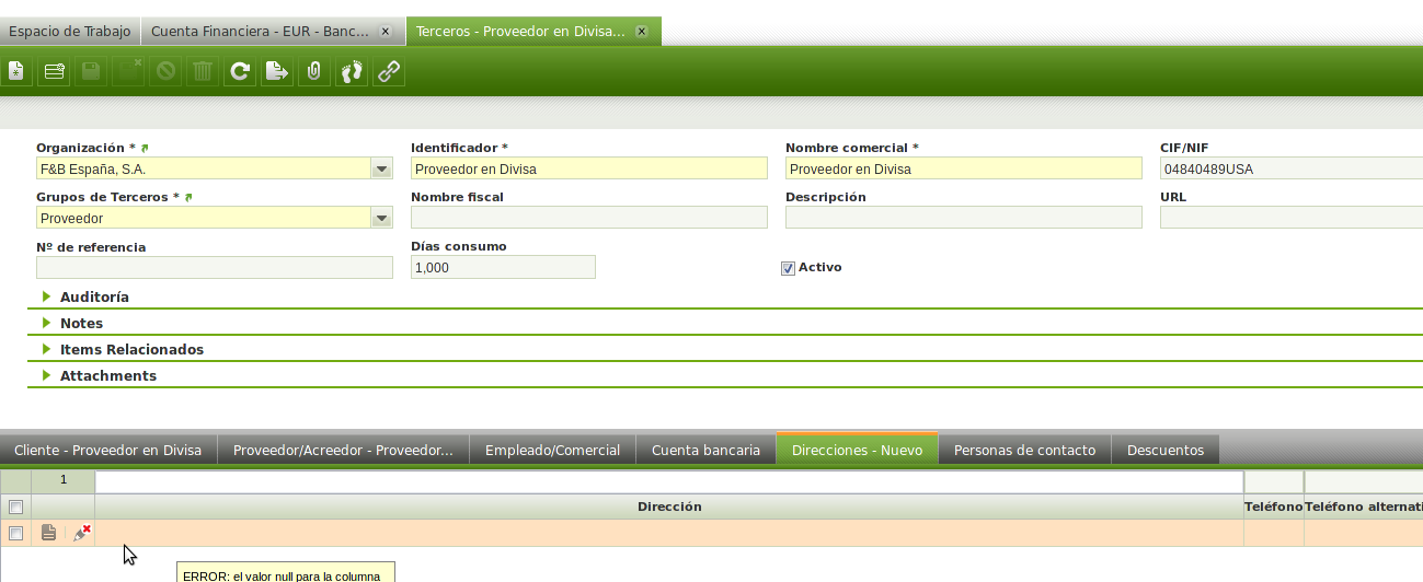 | Steps To Reproduce | Navigate to BP window create a new one record and enter: search key name save Inn the tab "Customer" remove the flag: Customer Go to Vendor/Creditor tab and enter the information required. Go to Location tab and create a new record Grid view is available. Press in the (lupa). A new window is shown. Enter Estados Unidos as Country and press ok. Try to save. Below error is shown, related to column "Name" as null. If the column "Name" is shown: a new record can be created (the column "Name" has a value (.) but the record can not be saved. It is only possible to create locations in form view. Creating the location in grid view provides an error in the column "Name" as it is created as null. | |||||||