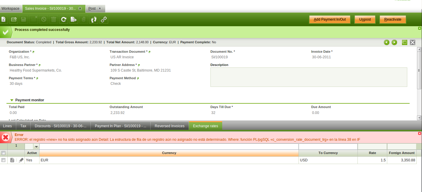 | Summary | 0017841: Exchange Rate at doc - It is possible to add an Exchange Rate in an invoice which is already processed/posted | |||||||