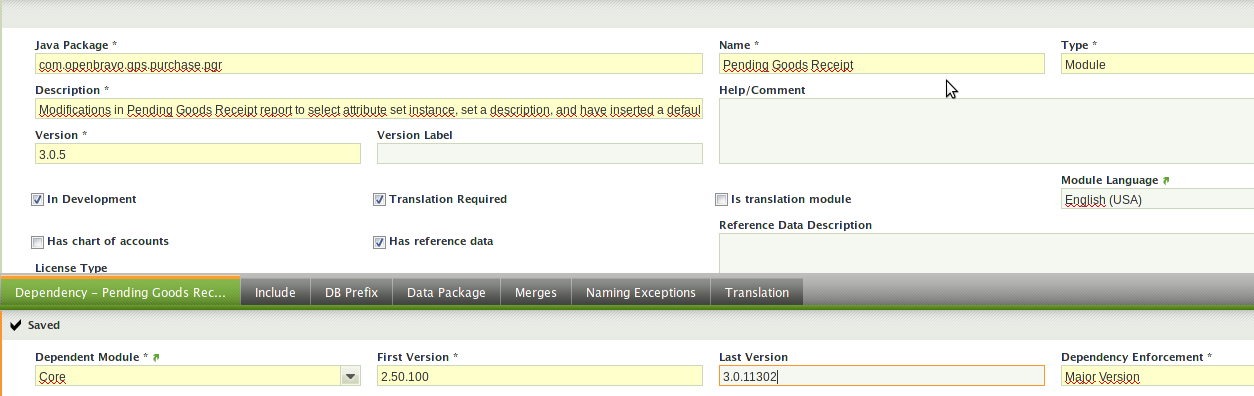 | Description | When trying to package a module with following dependency definition /see screenshot attached) following error is obtained: Pending Goods Receipt defines dependency on Core end versión 3.0.11302, but actual versión in DB is 3.0.12774 | |||||||
