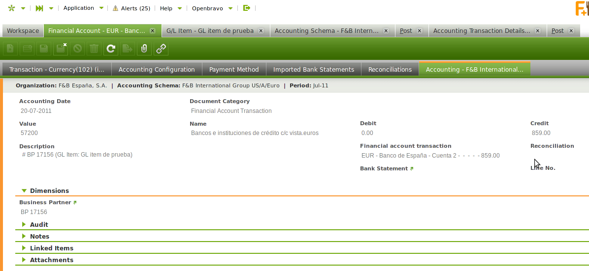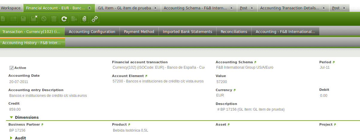 Test Plan: Go to Accounting Schema window. Select 'F&B international Group US/A/Euro' record. Go to Account Schema Element tab. Go to Financial Account window. Select 'Banco de EspaƱa-Cuenta 1' record. Press transaction button and add a transaction. Go to Transaction tab and notice the record that are displayed. You can see the accounting dimensions that are configured in the 'Account Schema Element' tab that you saw previously. |