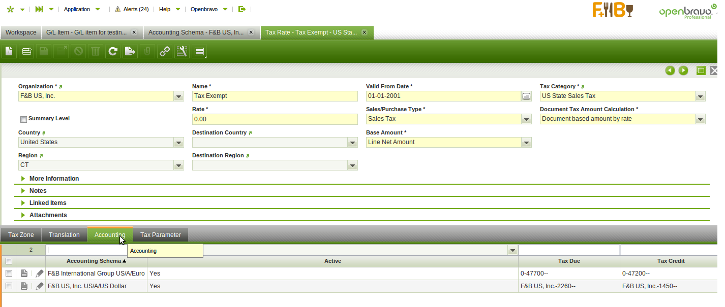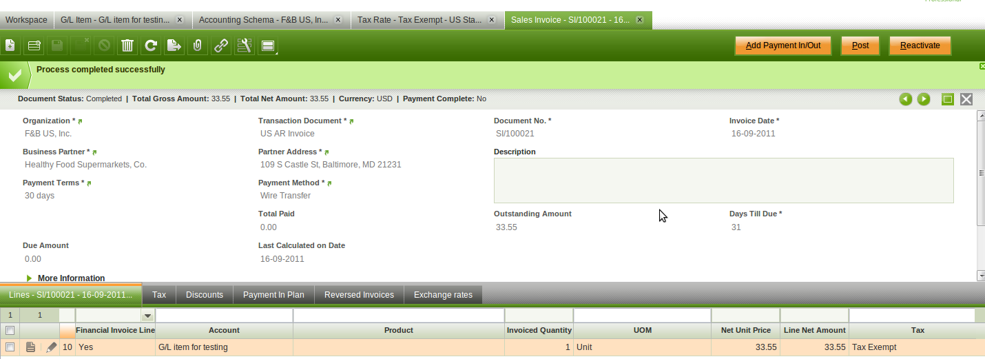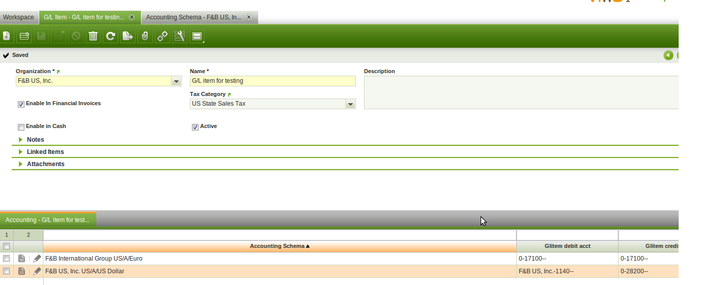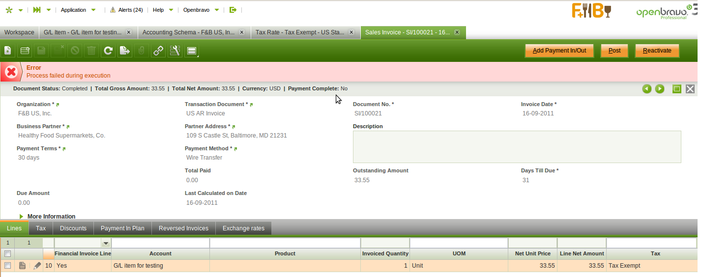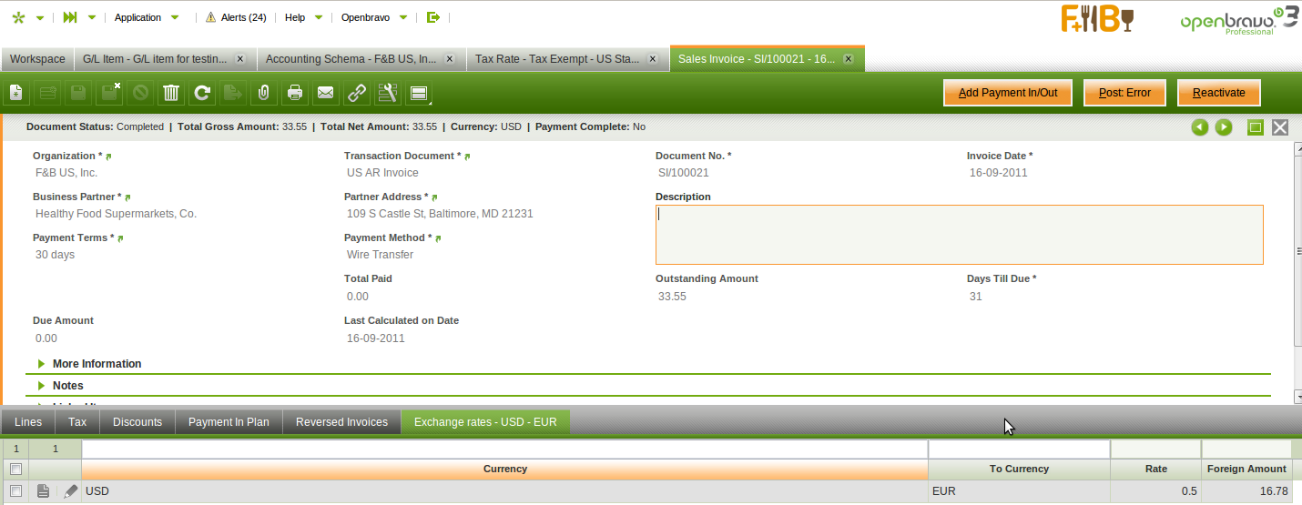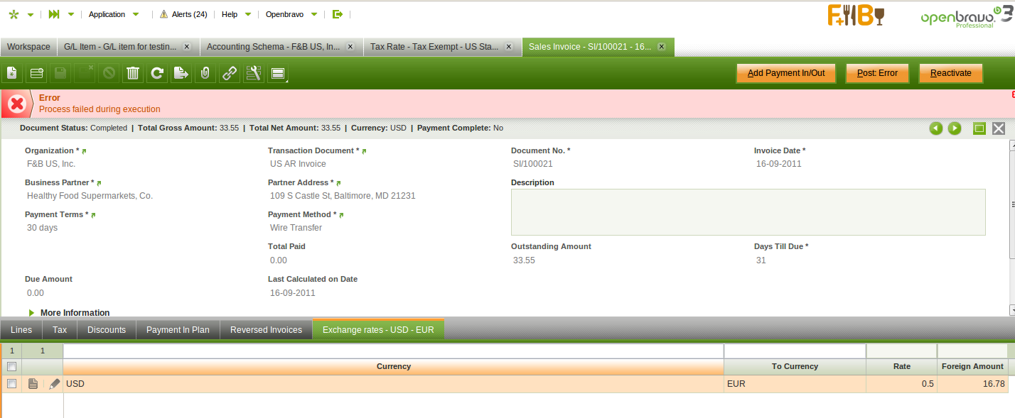 | Steps To Reproduce | Create a gl item for organization : F&B US Inc, by including the ledger accounts for both accounting schemas. Create a Tax rate for F&B US Inc organization, named "Tax Exempt" as a sales tax rate. Make sure that the ledger accounts for both acc. schemas are properly setup. Navigate to Sales Invoice and create a new one for F&B US Inc org. Select a BP with USD as currency. Select "Financial Invoice" flag and select the GL item previously create in the account field. Enter a net unit price of 33.55 and the tax exempt. Complete and try to post. You will get below error. It happens the same in case of: (1) entering an exchange rate from USD to EUR in the exchange rate tab. I even do have USD to EUR conversion rates at system level. (2) having 2 accounting schemas in USD, therefore no exchange rate is required. No problem/issue in case of posting a "normal" sales invoice, including a product and not a GL item. | |||||||