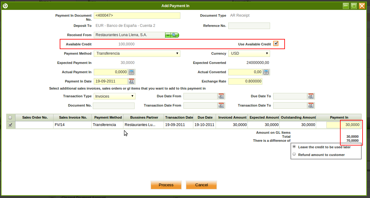 | Steps To Reproduce | 1) Create a Sales Invoice - Business Partner: Restaurantes Luna Llena, S.A. - Amount: 30$ USD 2) Create a Payment In of credit (generate) - Business Partner: Restaurantes Luna Llena, S.A. - Amount: 100€ EUR 3) Go to 'Banco de España - Cuenta 2' and configure 'Transferencia' payment method for 'Receive Payments in Other Currencies' 4) Click on 'Add Transaction' button. 5) Click on 'Add Payment In/Out' button 6) Select 'Restaurantes Luna Llena, S.A.' in Received From field 7) Select Transferencia in Payment Method combo box 8) Select USD in currency combo 9) Check 'Use Available Credit' checkbox 10) Notice that there is a difference of 70 With a exchange rate of 0.8 30$ --> 24€ the difference should be 100€ - 24€ = 76€ | |||||||