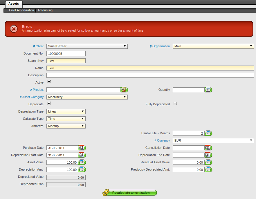 | Steps To Reproduce | 1) Go to Financial Management || Assets || Assets || Assets 2) Create a new Asset - Search Key: Test - Name: Test - Calculate Type: Time - Amortize: Monthly - Usable Life - Months: 2 - Purchase Date: 31-03-2011 - Depreciation Start Date: 31-03-2011 - Asset Value: 100 - Depreciation Amt: 100 3) Click on Calculate Amortization button The process fails, showing the following error: An amortization plan cannot be created for so low amount and / or so big amount of time | |||||||