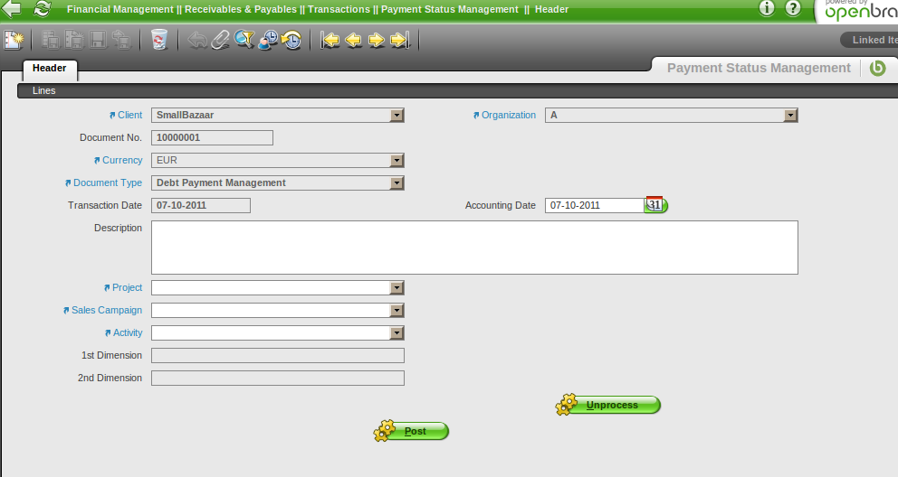 1) Go to Financial Management || Receivables & Payables || Transactions || Payment Status Management || Header