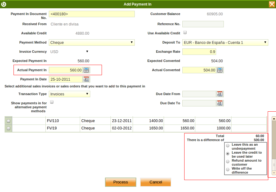 Proposed SolutionOpenbravo should show a message telling the end-user that the total amount of the scheduled payments is not equal to the Actual Payment In, therefore end user can scroll down and choose the right option or change the Actual Payment In.