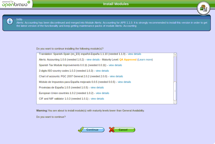 | Summary | 0019147: When trying to install Spanish Community Pack I got a wrong info about Alerts Accounting module | |||||||||||