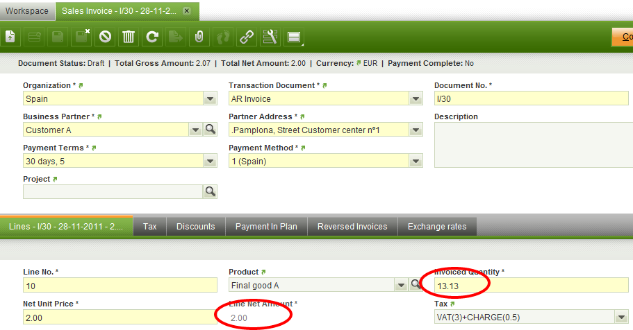 | Steps To Reproduce | Go to Sales Invoice window. Create a Header and move to Lines Create a new line and select a product In Invoiced Quantity field write "13.13" without moving the focus away. Click the Save button The field Line Net Amount remains with the old values, leading to an inconsistent Invoice. See screenshot. | |||||||