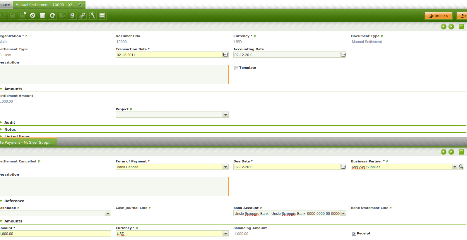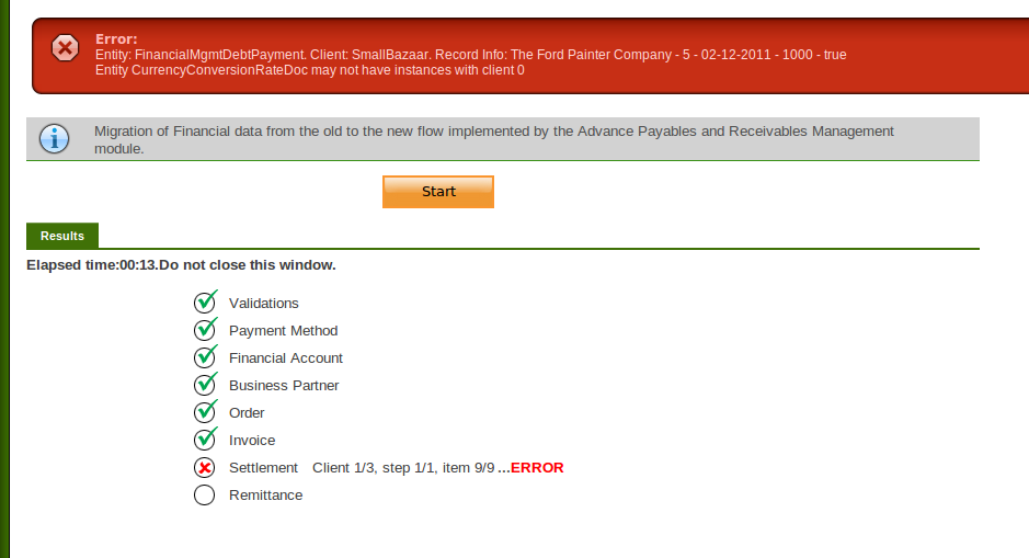 | Steps To Reproduce | In a 2.50 version (oracle or postgresql) create a manual settlement in USD, as the one in the screenshoot attached. Process it. Upgrade to Openbravo 3. Realize that the error attached is obtained. | |||||||||||
