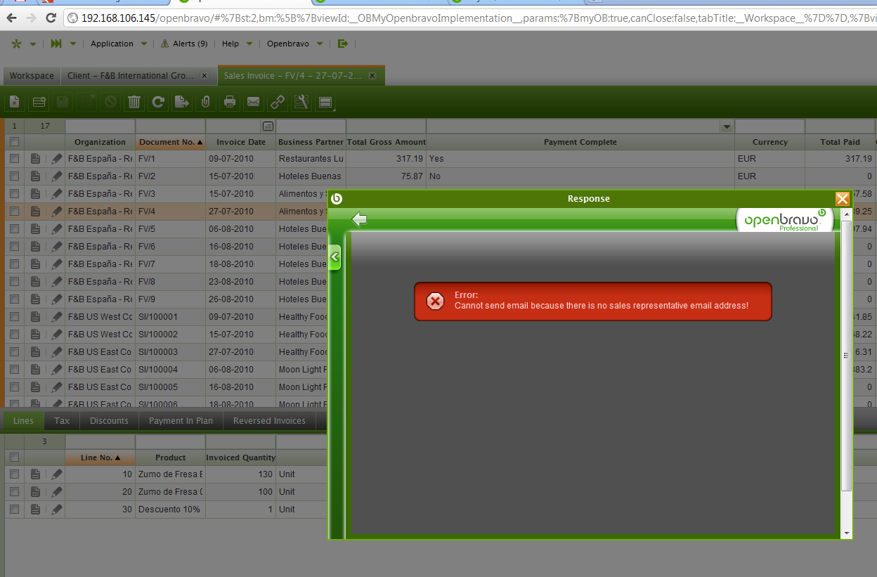 The issue is still reproducible. Steps to reproduce: - Open pi Openbravo in live.builds.openbravo.com - Using the F&B Group Admin role, open the Client window and enter the email configuration: * Active: yes * Smtp Server: smtp.openbravo.com * Smtp Server Account: smtp.openbravo.com * Smtp Server Sender Address: user.openbravo.com - Open Sales Order and select a completed order - Click the Email button in the toolbar, a popup will emerge. - Click the Send button in the popup. The old error message will appear. |