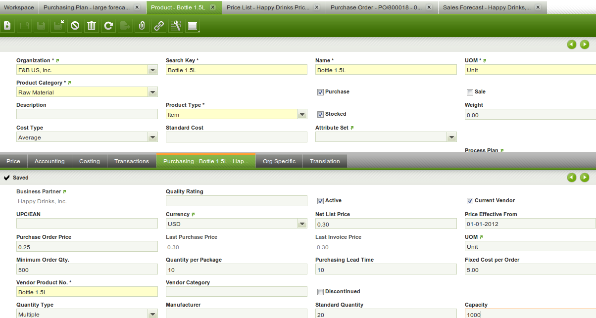 Enter a product that is purchased. Enter the Purchasing tab with the following information: Purchasing leadtime = 10, Capacity = 1000.