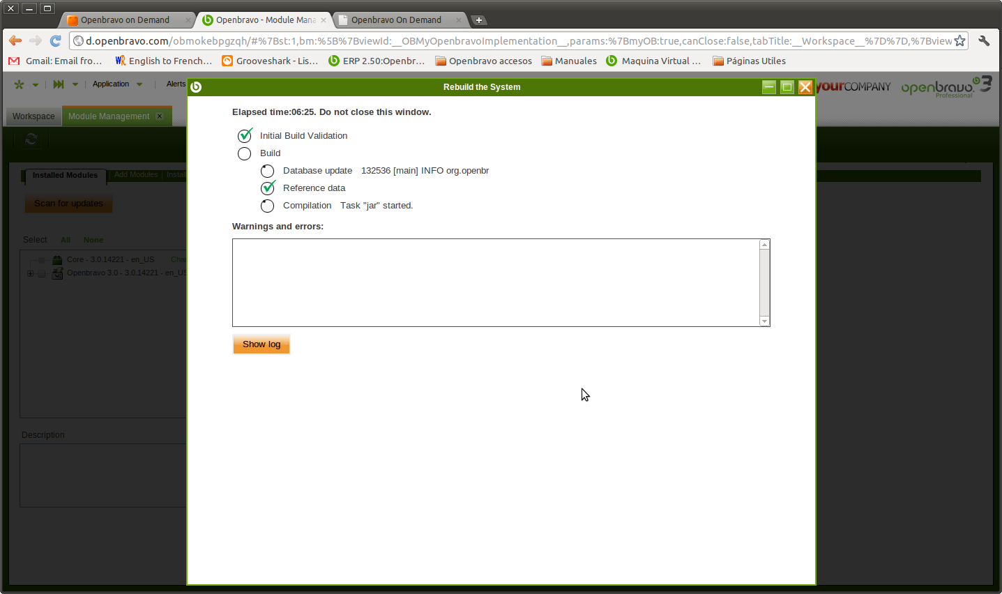 | Attached Files | set.code.rev: code.rev: init: core.lib: init: compile: build.jar: build: copy.core.lib: database.lib: init: compile: build.jar: jar: buildvalidation: [sql] Executing commands [sql] 2 of 2 SQL statements executed successfully buildvalidation: [java] 0 [main] INFO org.openbravo.buildvalidation.BuildValidationHandler - Executing build validation: org.openbravo.buildvalidation.Cbpvendoracct [java] 831 [main] INFO org.openbravo.buildvalidation.BuildValidationHandler - Executing build validation: org.openbravo.buildvalidation.DuplicatedJavaPackage [java] 840 [main] INFO org.openbravo.buildvalidation.BuildValidationHandler - Executing build validation: org.openbravo.buildvalidation.PaymentGLItemCheck [java] 849 [main] INFO org.openbravo.buildvalidation.BuildValidationHandler - Executing build validation: org.openbravo.buildvalidation.PreferenceConflict [java] 863 [main] INFO org.openbravo.buildvalidation.BuildValidationHandler - Executing build validation: org.openbravo.advpaymentmngt.buildvalidation.UniquePaymentForTransaction [java] 875 [main] INFO org.openbravo.buildvalidation.BuildValidationHandler - Executing build validation: org.openbravo.advpaymentmngt.buildvalidation.UnpostRefundPayments [java] 886 [main] INFO org.openbravo.buildvalidation.BuildValidationHandler - Executing build validation: org.openbravo.advpaymentmngt.buildvalidation.WrongPaymentScheduleDetailsCheck update.database: [sql] Executing commands [sql] 2 of 2 SQL statements executed successfully update.database.java: [java] Executing database update process without checking changes in local files. [java] 0 INFO - Database connection: jdbc:postgresql://localhost:6002/openbravo. User: tad [java] 1282 INFO - Executing full update.database [java] 1514 INFO - Reading tables... [java] 9330 INFO - Reading views... [java] 9451 INFO - Reading sequences... [java] 9460 INFO - Reading triggers... [java] 9523 INFO - Reading functions... [java] 10016 INFO - Sorting foreign keys, indexes and checks... [java] 10398 INFO - Starting function and trigger standardization. [java] 50137 INFO - Checking datatypes from the model loaded from the database [java] 50144 INFO - Original model loaded from database. [java] 59362 INFO - Checking datatypes from the model loaded from XML files [java] 59455 INFO - Loading data from XML files [java] 63569 INFO - Loading and applying configuration scripts [java] 63586 INFO - Applying structure part of configuration script: org.openbravo.v3 [java] 63590 INFO - Loading configuration script: /home/openbravo2/OpenbravoERP-3.0/openbravo-erp/modules/org.openbravo.v3/src-db/database/configScript.xml [java] Checking if database structure was modified locally. [java] Checking if data has changed in the application dictionary. [java] 64557 INFO - Executing default prescript [java] 65043 INFO - Executed 118 SQL command(s) successfully [java] 65058 INFO - Updating database model... [java] 65634 INFO - Executed 40 SQL command(s) successfully [java] 65660 INFO - Executed 5 forced SQL command(s) successfully [java] 65666 INFO - Model update complete. [java] 65738 INFO - Disabling foreign keys [java] 74398 INFO - Executed 2322 SQL command(s) successfully [java] 74402 INFO - Disabling triggers [java] 74787 INFO - Executed 273 SQL command(s) successfully [java] 76532 INFO - Executed 633 SQL command(s) successfully [java] 76546 INFO - Executing moduleScript: org.openbravo.modulescript.AdminFlagOnCreateDefaults [java] 76562 INFO - Executing moduleScript: org.openbravo.modulescript.CreateDoctypeTemplate [java] 76574 INFO - Executing moduleScript: org.openbravo.modulescript.HBFix [java] 76582 INFO - Executing moduleScript: org.openbravo.modulescript.InitializeAlertStatus [java] 76591 INFO - Executing moduleScript: org.openbravo.modulescript.UpdateEmailPasswords [java] 76603 INFO - Executing moduleScript: org.openbravo.modulescript.UpdateFinancialAccountAccounts [java] 76613 INFO - Executing moduleScript: org.openbravo.modulescript.UpdateReversalDocumentTypes [java] 76627 INFO - Executing moduleScript: org.openbravo.advpaymentmngt.modulescript.AlertsForWrongInvoices [java] 76649 INFO - Executing moduleScript: org.openbravo.advpaymentmngt.modulescript.CreateAccountingConfiguration [java] 76712 INFO - Executing moduleScript: org.openbravo.advpaymentmngt.modulescript.CreateDocumentNoSequence [java] 76734 INFO - Executing moduleScript: org.openbravo.advpaymentmngt.modulescript.InitializeAPRMReadyPreference [java] 76745 INFO - Executing moduleScript: org.openbravo.advpaymentmngt.modulescript.UpdateCustomerBalance [java] 76752 INFO - Executing moduleScript: org.openbravo.advpaymentmngt.modulescript.UpdateGeneratedUsedCreditColumns [java] 76762 INFO - Executing moduleScript: org.openbravo.advpaymentmngt.modulescript.UpdateReconciliationProcessButtonValue [java] 76769 INFO - Executing moduleScript: org.openbravo.userinterface.selector.UpdateLanguageColumn [java] 76777 INFO - Executing moduleScript: org.openbravo.userinterface.skin.s250to300Comp.modulescript.DefaultSkin [java] 76786 INFO - Executing moduleScript: org.openbravo.v3.datasets.SetDefaultRole [java] 76795 INFO - Loading and applying configuration scripts [java] 76802 INFO - Applying data part of configuration script: org.openbravo.v3 [java] 76806 INFO - Loading configuration script: /home/openbravo2/OpenbravoERP-3.0/openbravo-erp/modules/org.openbravo.v3/src-db/database/configScript.xml [java] 77719 INFO - Comparing databases to find differences [java] 81166 INFO - Updating Application Dictionary data... [java] 81172 INFO - Removing invalid rows. [java] 81381 INFO - Executed 173 SQL command(s) successfully [java] 81387 INFO - Recreating Primary Keys [java] 81491 INFO - Executing update final script (NOT NULLs and dropping temporary tables) [java] 83149 INFO - Executed 144 SQL command(s) successfully [java] 85475 INFO - Executed 689 SQL command(s) successfully [java] 85787 INFO - Executed 40 SQL command(s) successfully [java] 85830 INFO - Executed 4 forced SQL c