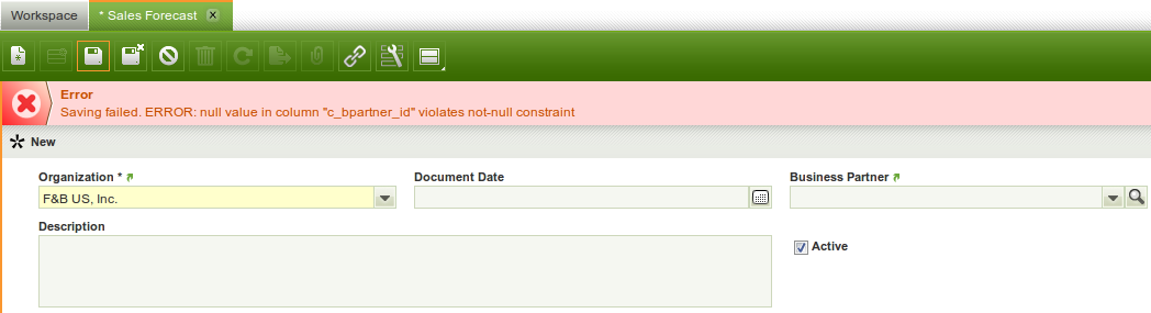| Description | Business Partner field in Sales Forecast Window (MRP) is mandatory at database level but is not shown as mandatory (yellow) in the application. | |||||||