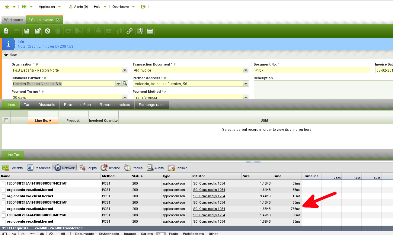 | Steps To Reproduce | * Using Chrome * Open Dev Tools window, switch to Network panel, and filter by XHR requests * Open Sales Invoice window * Click NEW * Pick a Business Partner from the drop down list * Check the network log, * Pick another Business Partner from the same list * Repeat the process several times * You'll find some calls with more than 700ms Attached a pic | |||||||||||