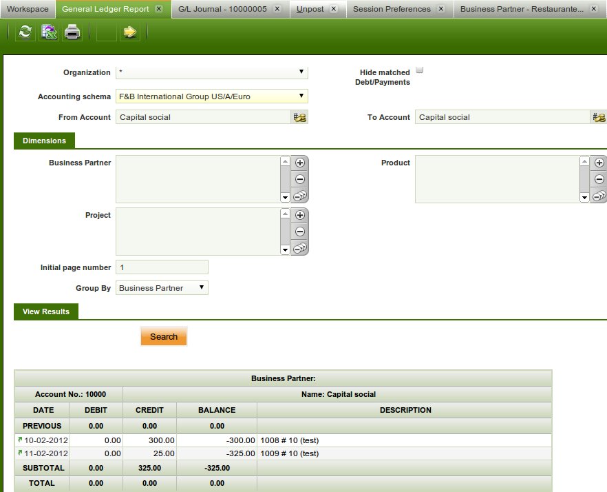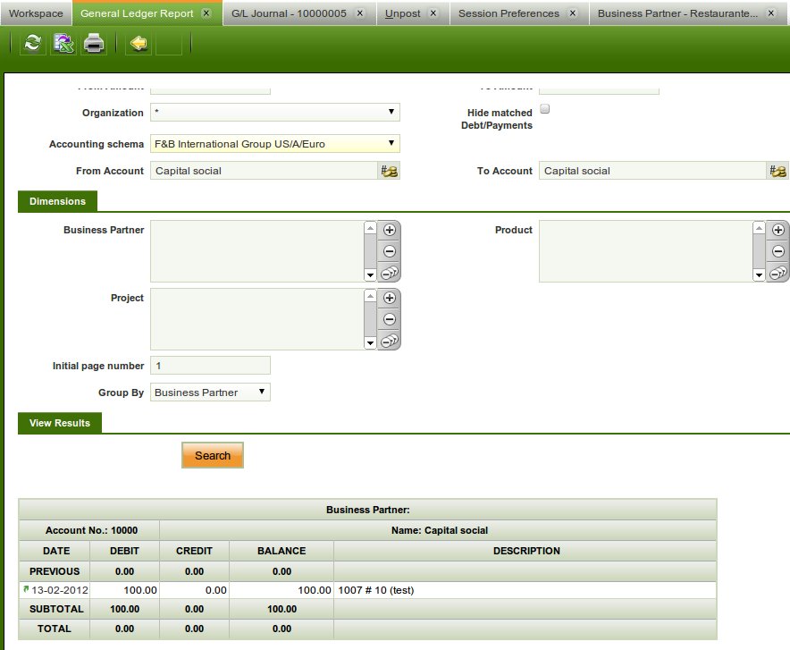 | Steps To Reproduce | . create new g/l journal: schema: F&B International Group US/A/Euro accounting date: 10/02/2012 new line: accounting combination 0-11400 debit 300 new line: accounting combination 0-10000 credit 300 process and post . create new g/l journal: schema: F&B International Group US/A/Euro accounting date: 11/02/2012 new line: accounting combination 0-11400 debit 25 new line: accounting combination 0-10000 credit 25 process and post . create new g/l journal: schema: F&B International Group US/A/Euro accounting date: 13/02/2012 new line: accounting combination 0-10000 debit 100 new line: accounting combination 0-11400 credit 100 process and post . go to session preferences window: . records range: 2 . go to general ledger report: . date from: 01/01/2012 . date to: 31/12/2012 . organization: * . accounting schema: F&B International Group US/A/Euro . from account: capital social . to account: capital social . group by: business partner run report: Business Partner: Account No.: 10000 Name: Capital social DATE DEBIT CREDIT BALANCE DESCRIPTION PREVIOUS 0.00 0.00 0.00 10-02-2012 0.00 300.00 -300.00 1008 # 10 (test) 11-02-2012 0.00 25.00 -325.00 1009 # 10 (test) SUBTOTAL 0.00 325.00 -325.00 TOTAL 0.00 0.00 0.00 . click in arrow button to go to the next page Business Partner: Account No.: 10000 Name: Capital social DATE DEBIT CREDIT BALANCE DESCRIPTION PREVIOUS 0.00 0.00 0.00 13-02-2012 100.00 0.00 100.00 1007 # 10 (test) SUBTOTAL 100.00 0.00 100.00 TOTAL 0.00 0.00 0.00 I have attached 2 screenshots | |||||||