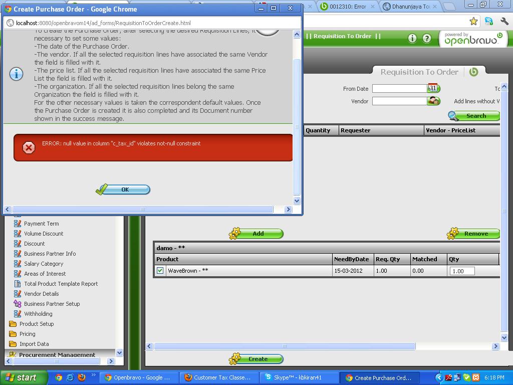 | Description | when i select product and click on the create i am getting the error like"null value in column "c_tax_id" violates not-null constraint" | |||||||