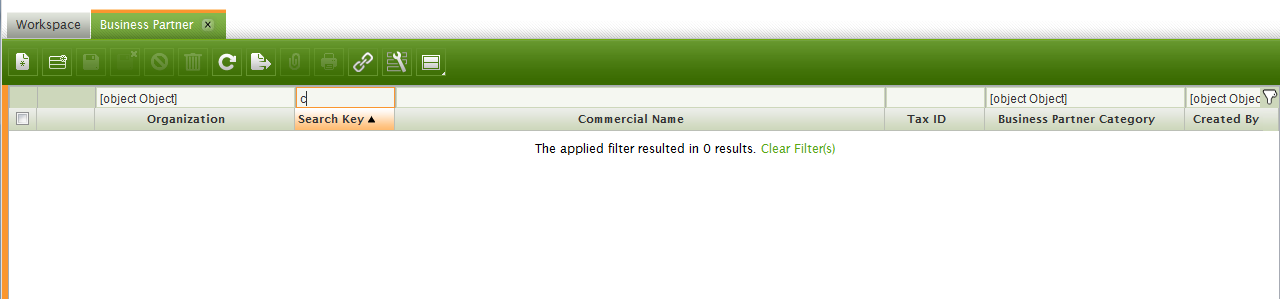 | Steps To Reproduce | With an instance upgraded to Smartclient 8.3d 2012-03-12 (or later) Login into the application. Open "Business Partner" window Write anything in "Search Key" column filter. Notice that "Organization" and "Business Partner Category" column filter now displays [object Object] | |||||||