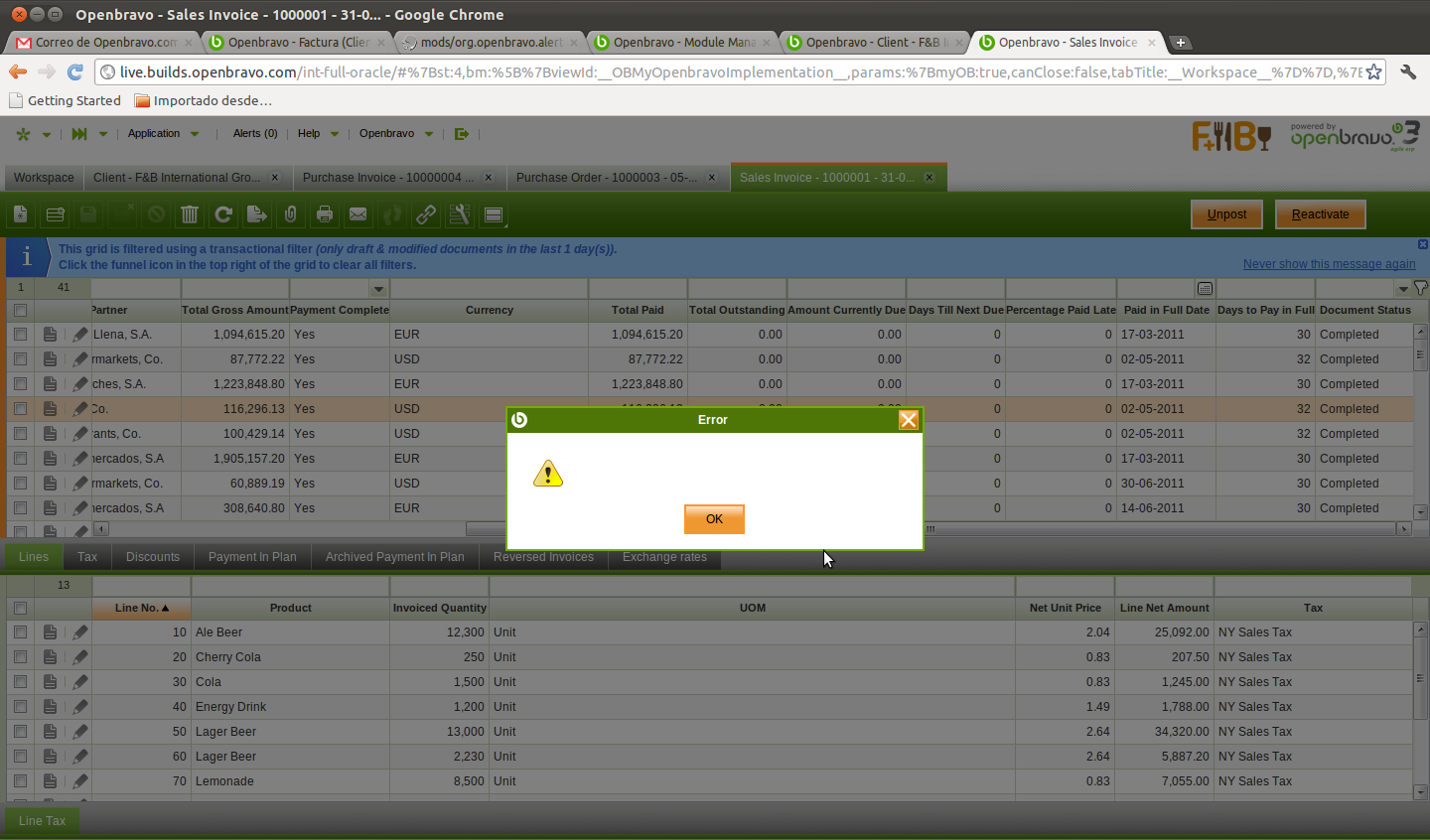 | Steps To Reproduce | As group admin role, Go to Client window Go to Email configuration tab: Configure it Go to Sales invoice or Purchase Invoice window Send an email of one completed invoice, correct Void one invoice, try to send it by email. An error appear (see screenshot) If you check the log (attached) it is a null pointer exception error. | |||||||
