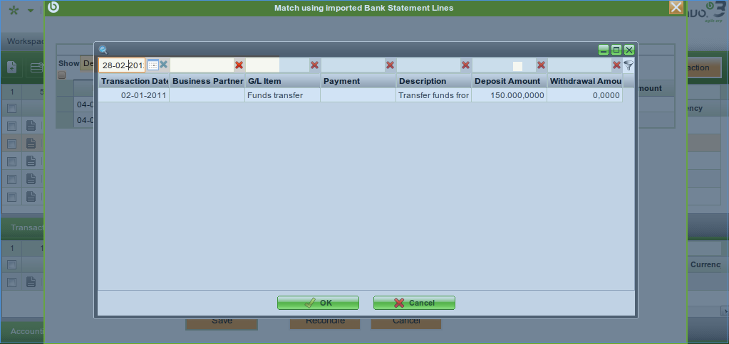 Test Plan: Go to "Financial Account" Select record "Bank - Account 2" In form mode do this change if it is not already done: Matching Algorithm -> Standard Now go to its child tab "Imported Bank Statement" Create new one and fill Name: "test" Now go to its child tab "Bank Statement Lines" Create new one and fill Reference No: Line1 Amout IN: 10 Create new one and fill Reference No: Line2 Amout IN: 20 Click button "Process" Click button "Match Statement" Click the magnifier glass icon. The grid opens, enter a date in the first column, notice that the date is not changing to current date. |