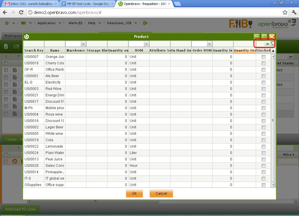 | Steps To Reproduce | Step 1) Navigate to procurement Management||Transactions||Requisition Step 2) place the cursor In the Requisition tab, click insert row icon, a new requisition document will be generated and the focus will be in the Business partner field, with out any changes move the cursor to Lines tab. Step 3) Again click 'Insert row' icon, a new line item record will be created and the tab focus will be product field. Click the magnifier icon to select the Products. Step 4) product selector popup window will be opened with the list of products which are not stocked. Step 5) Press Tab key, and navigate the tab focus to stocked filter field, with out changing any value again press tab button. Issue: In the stocked Filter field the value 'NO' gets automatically removed. Again place the cursor in the Stocked filter field and press tab or "Shit+tab" now both stocked and not stocked products will get listed in the Product popup window. | |||||||