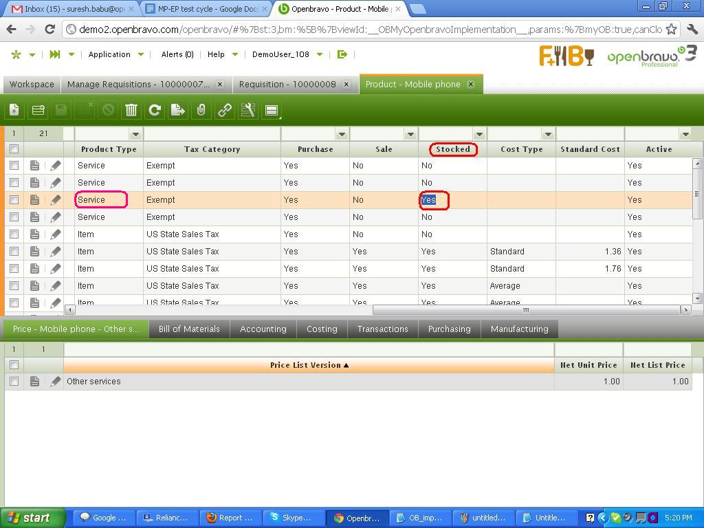 | Summary | 0020509: Able to select Stocked option for Product which has product type as service in the grid view and not in form view | |||||||
