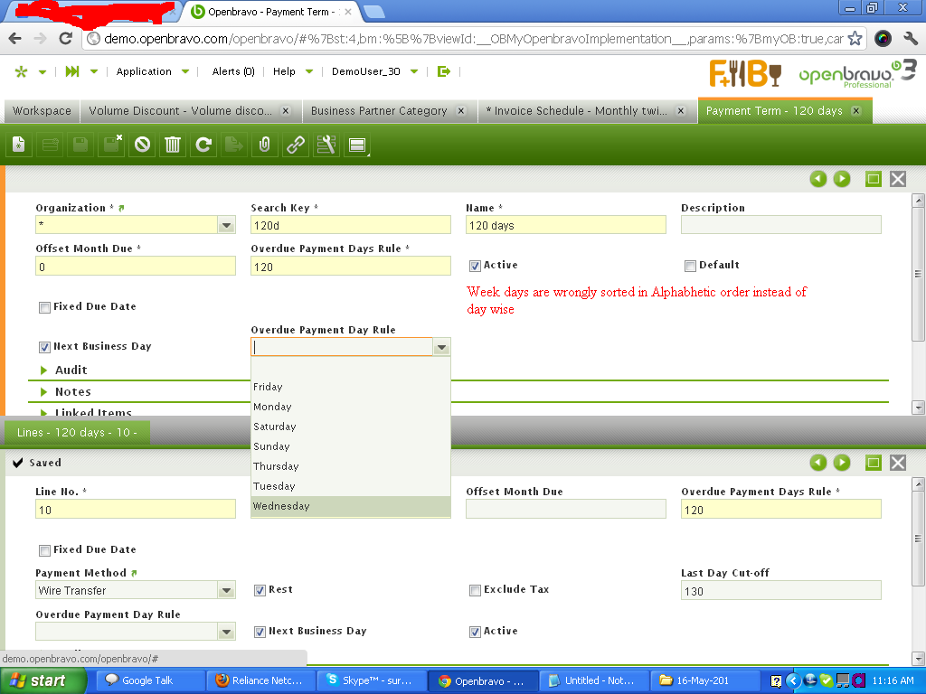 | Steps To Reproduce | Step 1: Navigate to Master Data Management || Business Partner Setup || Payment terms Step 2: Click "Create a new record in form view" icon in the right side of the page Step 3: In the header, click the 'Overdue Payment Day Rule' list box, Defect: values are sorted wrongly by Alphabetical (ascending) order instead of day wise like Monday, Tuesday, Wednesday.. | |||||||