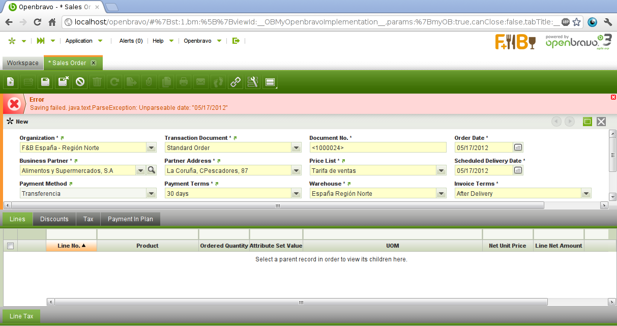 | Steps To Reproduce | * Change Openbravo.propeties to use mm/dd/yyyy as date format * Compile (or copy config/Openbravo.properties to WEB-INF/ in your context) * Create a new Sales Order * Try to save (See attached pic) | |||||||