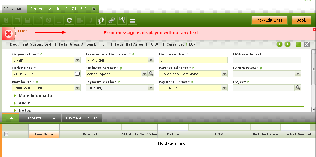 | Description | while selecting line items for Return to vendor document using Pick/Edit Lines option, In the "Pick/Edit Lines" window when the user clicks Done without entering any value in Returned field, System throws error message without any message. | |||||||