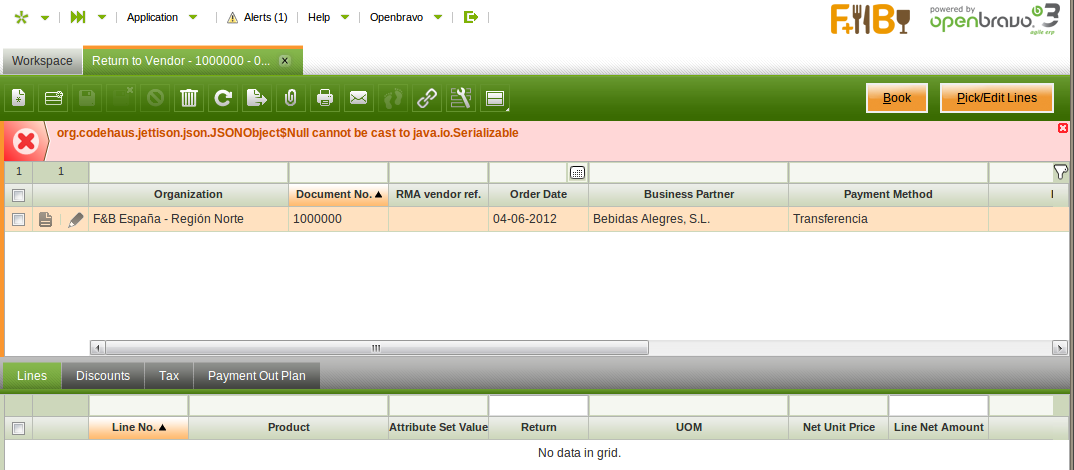 | Steps To Reproduce | 1) Go to Return To Vendor window 2) Click on New - Org: F&B España - Región Norte - Business Partner: Bebidas Alegres, S.L. 3) Click on Pick/Edit Lines 4) Clear the filter 5) Select any line without Attribute Set Value 6) Enter returned quantity 7) Click on Done button 8) Error: java.lang.ClassCastException: org.codehaus.jettison.json.JSONObject$Null cannot be cast to java.io.Serializable | |||||||