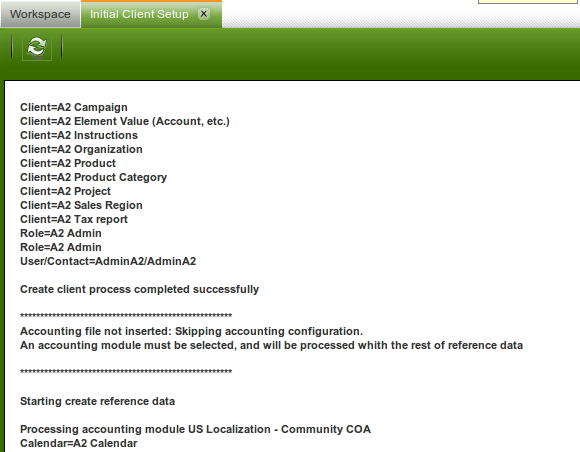 | Description | After executing the Initial Client setup, the completion message contains a typo: Create client process completed successfully ***************************************************** Accounting file not inserted: Skipping accounting configuration. An accounting module must be selected, and will be processed whith the rest of reference data | |||||||