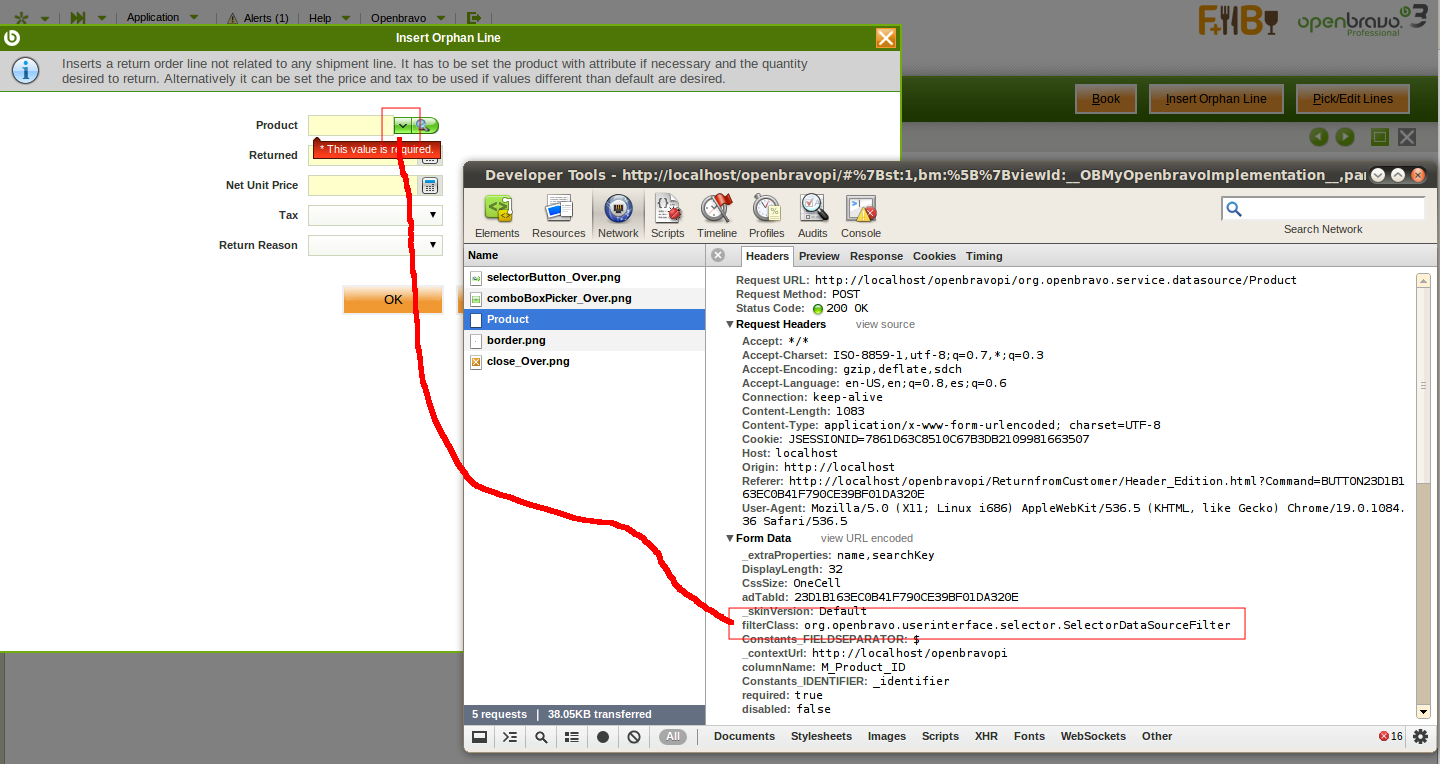 | Steps To Reproduce | 1) Create a new preference - Org: * - Property: RM Allow Orphan Line - Value: Y 2) Logout and login again 3) Create a new Return from Customer - Org: F&B España - Región Norte - Business Partner: Alimentos y Supermercados, S.A 4) Click on Insert Orphan Line button 5) In the popup click on the picker for the Product selector The request contains info about the filter class to apply filterClass:org.openbravo.userinterface.selector.SelectorDataSourceFilter Realize that the filter class defined for this selector is executed org.openbravo.erpCommon.info.RMProductSelectorFilterExpression and only products for Spain tree are displayed 6) Close the popup (because the result in in the cache) 7) Click again on Insert Orphan Line button 8) Click on the magnifying glass icon Check the request, it does not have the filterclass info DataSourceSevlet class on line 186 it does not have any value on String filterClass = parameters.get(DataSourceConstants.DS_FILTERCLASS_PARAM); As result the org.openbravo.erpCommon.info.RMProductSelectorFilterExpression is not executed and all the products are displayed (without filtering). | |||||||
