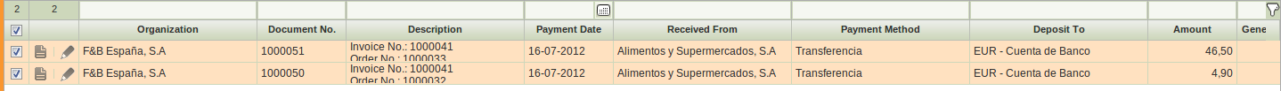 code review + testing OK Testing Plan I 1) Configure "Transferencia" payment method for "Alimentos y Supermercados, S.A" to generate the payemnt automatically when completing the invoice. 2) Create Sales Order (SO1), total=5€ 3) Create Sales Invoice (SI1) for previous order 4) Complete the invoice --> a new payment is created 5) Refresh the invoice and check: - Payment Complete = Yes - Payment Plan * Number of payments = 1 * Expected Amount = Received Amount * Outstanding = 0 7) Go to the Payment In and search previously created payment. Check: - Description Invoice No.: SI1 Order No.: SO1 - Amount = Invoice total gross amount Testing Plan II 1) Configure "Transferencia" payment method for "Alimentos y Supermercados, S.A" to generate the payemnt automatically when completing the invoice. 2) Create Sales Order (SO1), total=5€ 3) Create Sales Order (SO2), total=5€ 4) Create Sales Invoice for both orders 5) Complete the invoice --> a new payment is created 6) Refresh the invoice and check: - Payment Complete = Yes - Payment Plan * Number of payments = 1 * Expected Amount = Received Amount * Outstanding = 0 7) Go to the Payment In and search previously created payment. Check: - Description Invoice No.: SI1 Order No.: SO1, SO2 - Amount = Invoice total gross amount Testing Plan III 1) Configure "Transferencia" payment method for "Alimentos y Supermercados, S.A" to generate the payemnt automatically when completing the invoice. 2) Create Sales Order (SO1), total=5€ 3) Pay fully previous order. (create a new payment in). 4) Create Sales Invoice (SI1) for previous order 5) Complete the invoice --> as the order has been fully paid NO payment is generated 6) Refresh the invoice and check: - Payment Complete = Yes - Payment Plan * Number of payments = 1 * Expected Amount = Received Amount * Outstanding = 0 Testing Plan IV 1) Configure "Transferencia" payment method for "Alimentos y Supermercados, S.A" to generate the payemnt automatically when completing the invoice. 2) Create Sales Order (SO1), total=5€ 3) Pay partially previous order. (create a new payment in of 3€). 4) Create Sales Invoice (SI1) for previous order 5) Complete the invoice --> a new payment is created for the difference (2€) 6) Refresh the invoice and check: - Payment Complete = Yes - Payment Plan * Number of payments = 2 * Expected Amount = Received Amount * Outstanding = 0 7) Go to the Payment In and search previously created payment. Check: - Description Invoice No.: SI1 Order No.: SO1 - Amount = 2€ |
