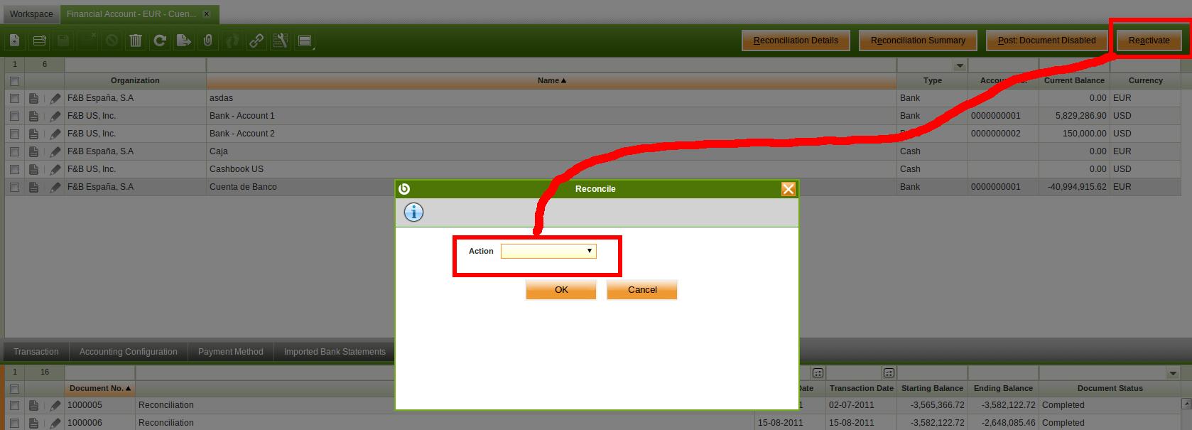 | Steps To Reproduce | 1) Go to Financial Account window 2) Select "Cuenta de banco" 3) Go to Reconciliations tab 4) Select Reconciliation 1000014 5) Click on reactivate button 6) Realize that you cannot select any action in the popup | |||||||