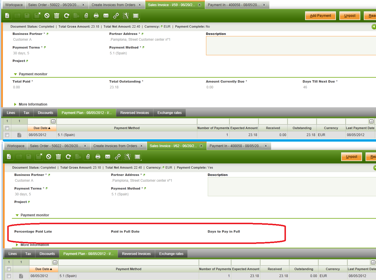 Alternative test plan I: 1. Create a Sales Invoice for Healthy food Supermarkets, payment term 30 days 2. Enter a line, amount=100, and complete it 3. Press Add Payment button and introduce 20 USD. Payment date = today. Select leave this as an underpayment 4. In the payment monitor section, the Percentage Paid Late is not shown 5. Press Add Payment button and introduce 50 USD. Payment date = 2014 year. Select leave this as an underpayment. 6. In the payment monitor section, the Percentage Paid Late shows 50% (which is the amount we have paid after the due date) 7. Now fully pay the invoice. Payment date= today. 8. In the payment monitor section, the Percentage Paid Late shows 50% (which is the amount we have paid after the due date), and the Paid in Full Date and Days to pay in full fields reflect the day we have introduced in step 5. Alternative test plan II: 1. Repeat test plan I for purchase invoices |