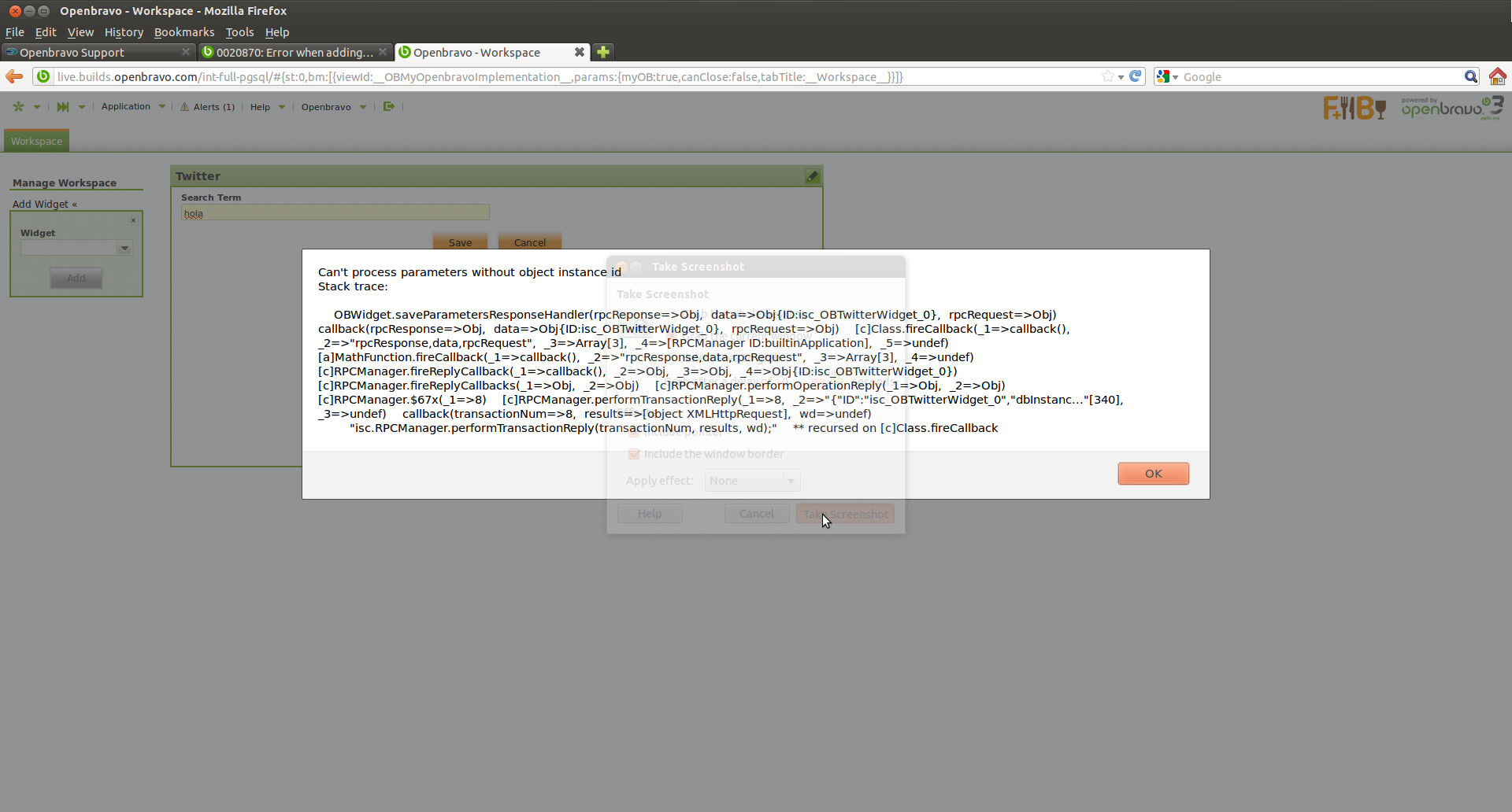 DescriptionWhen adding a widget with parameters, with the Admin Others utility Openbravo returns the following error: "Can't process parameters without object instance id"