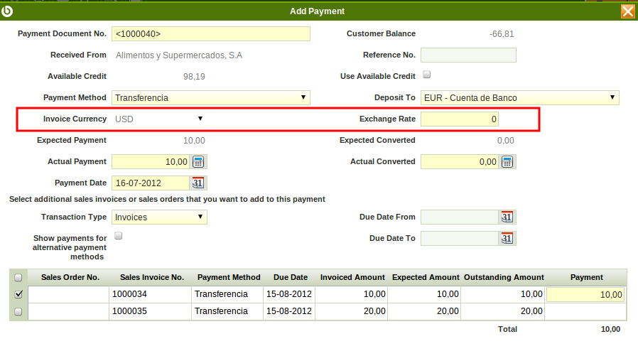 | Description | Having commas (,) configured as decimal separator (see attached Format.xml file) the exchange rate is always retrieved with dot as decimal separator. Reproducible on: - Add Payment From Invoice - Add Payment From Transaction | |||||||