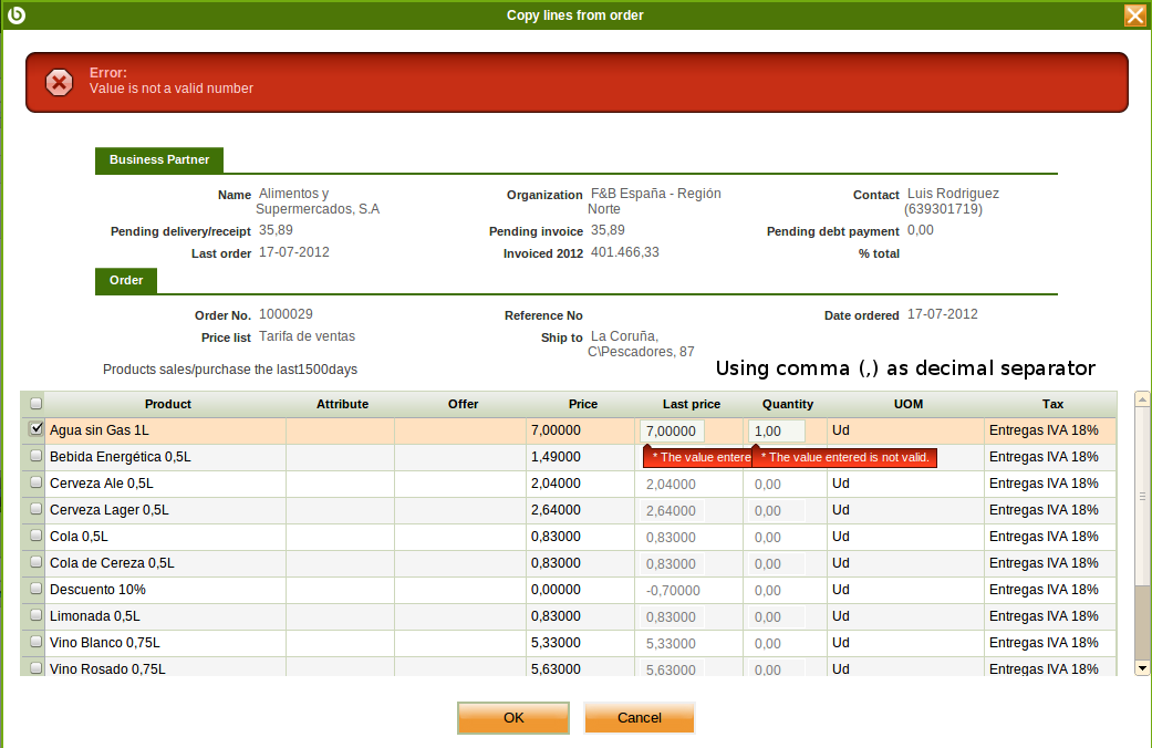 | Steps To Reproduce | 1) Create a new Sales Order header for Alimentos y Supermercados, S.A with 2) Create a new line + Product: Agua sin Gas 1L + Quantity: 1 3) Book the order 4) Create a new Sales Order for Alimentos y Supermercados, S.A with 5) Click on "Copy Lines" button 6) Select previously created sales order line (checkbox in the left side) 7) Edit the quantity to = 2 8) Click on OK button 9) You will get an error: * The value entered is not valid. | |||||||