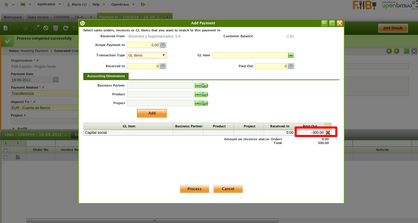 | Steps To Reproduce | 1. Access "Payment In" window and create header for any BP and FA 2. Press "Add details" and select "GL Item" option. Select any gl item and set "Paid Out"=5. Process payment 3. Realize that your payment has 2 lines: one of -5 EUR associated to your glitem and another one of 5 EUR credit for that BP. Which is OK. 4. Reactivate Payment. Select GLItem option and realize that "Paid Out" amount associated to your glitem is not 5 but -5, which is not correct see screenshot for more reference | |||||||