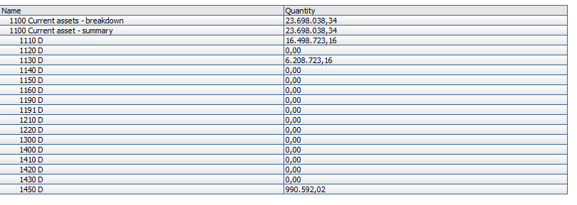 Test done to verify: 1. Create report for the breakdown account element 1100 (Current assets). Report name "1100 Current Assets - Breakdown" 2. Create another report which is summary and named "1100 Current Assets - summary". In this report as it is summary we add all the subaccounts that belong to it Expected behaviour: The result in both report must be the same. Current behaviour: The result is the same. See attach result1.png |