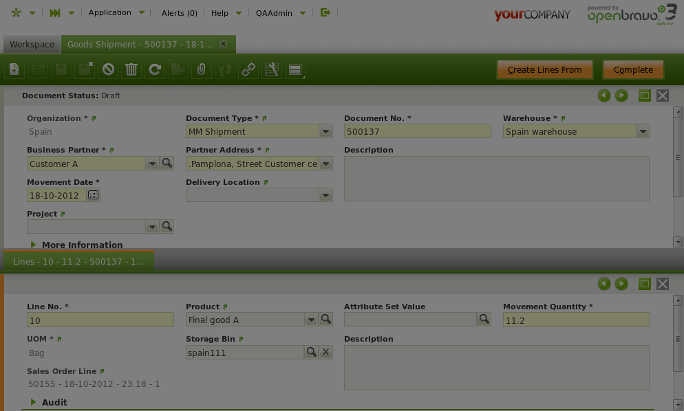 | Steps To Reproduce | Login with: "User name": QAAdmin "Password": QAAdmin Go to Sales management || Transactions || Sales order Click New and select: "Transaction Document": Standard Order "Business partner": Type CUSA and press enter key. Customer A value should be showed instead Move to lines Click new and type FGA for the product and press Enter key. Change the "Ordered Quantity" to 11.2 and save Move back to the Header tab Click Book button and press OK Go to Sales management || Transactions || Goods Shipment Click New and select: "Document Type": MM Shipment "Business partner": Type CUSA and press enter key. Customer A value should be showed instead Once you have the business partner Customer A in place, save Click "Create Lines From". A pop-up gets opened. Do: Click the Warehouse icon and select the record (spain111). You might need to remove "USA warehouse%" and click search. Then select spain111 Select the sales order created in [SALa010] in the combo Order In the grid it will appear one record. Mark the record and press the OK button A green success message will appear: Process completed successfully Move to Lines tab. Select the record and enter in form view Click the icon for the product. A pop-up should be opened. You get nothing instead, see attach. | |||||||