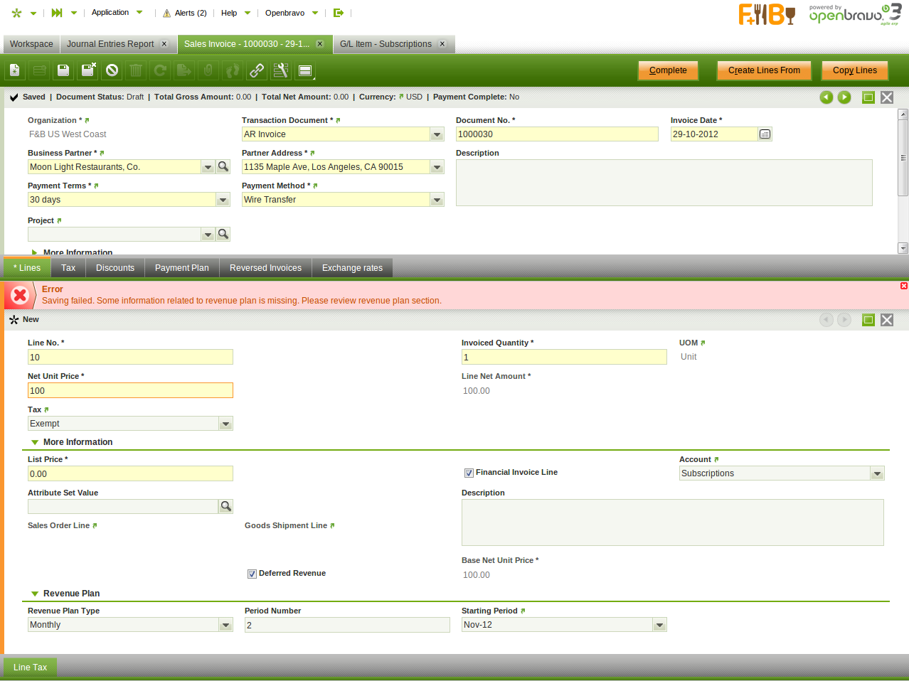 | Steps To Reproduce | 1) Create sales invoice line as a financial invoice 2) Specify all attributes 3) Marked Deferred Revenue 4) Specify revenue plan Save. You get an error. See screenshot. | |||||||