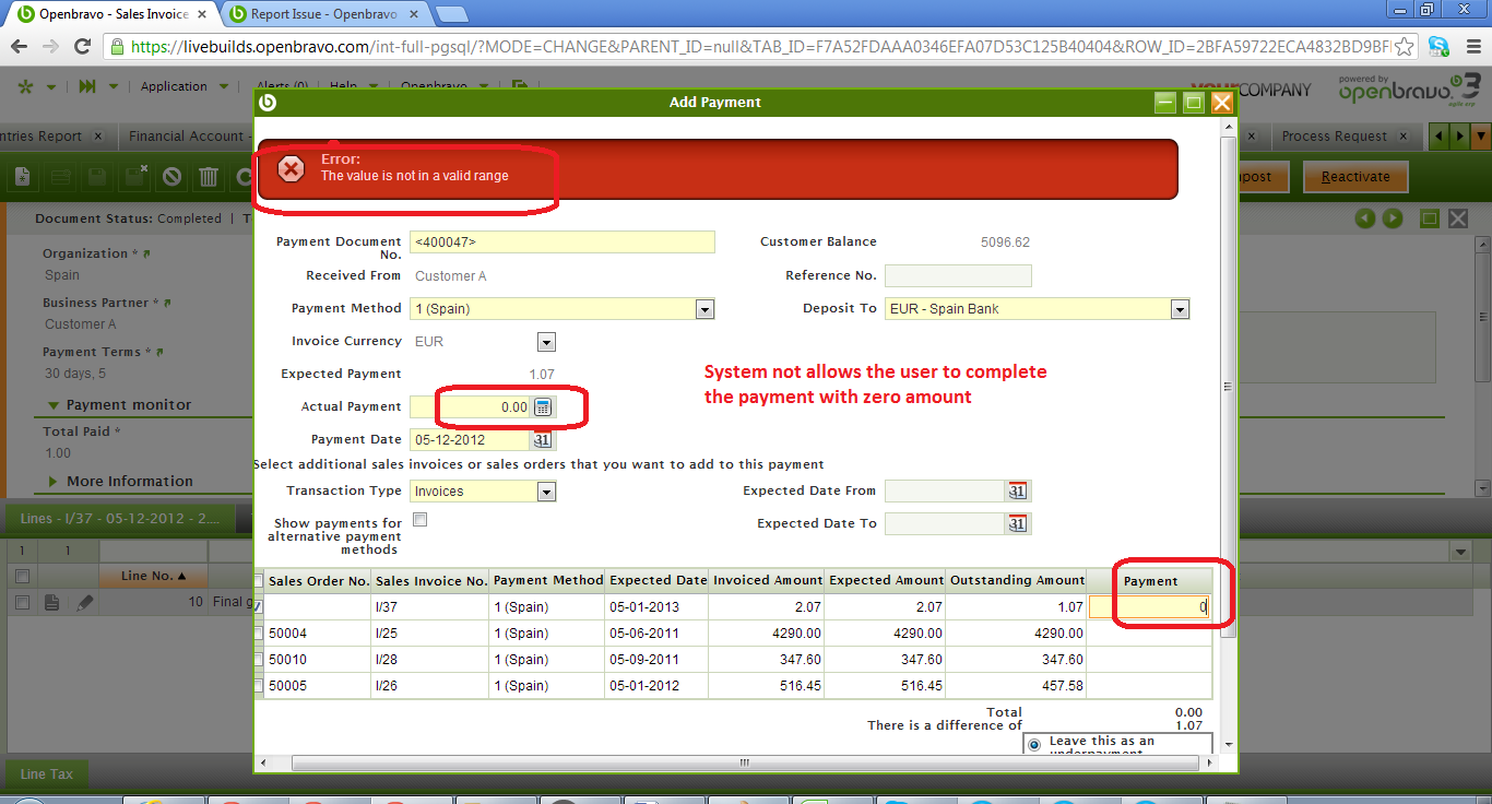 Notice that the system throws the error message as "You cannot leave as an underpayment a zero amount Payment"